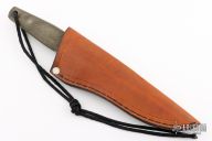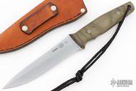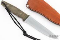 This CQB1 is a Bob Terzuola design executed by Camillus. It features a silver finished blade with false top edge, notched thumb ramp, .166" blade stock and 1.290" blade depth, full tang construction. The handle is comprised of green canvas micarta scales with lanyard hole over notched tang. Includes a brown leather sheath, not original but fits nicely. Has some scuffs, otherwise excellent condition.