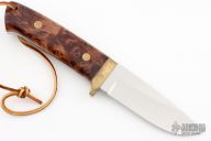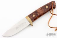 This knife by Black Oak Blades features a mirror polished blade with .121" blade stock and 1.222" blade depth, full tang construction. The handle has a brass guard and burl wood scales with brass pins. Has a couple light scratches, otherwise excellent condition.