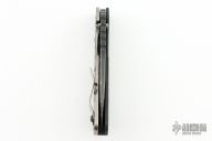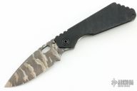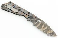 This SMF by Mick Strider features a laser engraved blade with thumbhole and notched thumbrest. The handle has laser engraved black aluminum and titanium frame and tip up titanium clip, has black hardware and an anodized titanium lockbar stabilizer. Notches on thumbrest, rear of handle. Nice detent, blade seating and lockup. Excellent Condition.