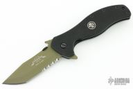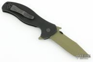 This Battalion by Emerson features a green coated partially serrated tanto blade with thumb disk and notched thumbrest, flipper and wave feature. Handle is black G10 with black titanium liners, black standoffs, black stainless steel tip up clip, and lanyard hole. Excellent condition. Comes with original box and papers.