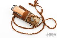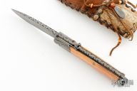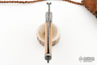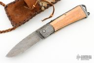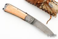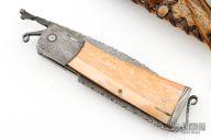 This friction folder by Master Smith Daniel Winkler features a Damascus blade with fileworked spine and decorative friction bar. The handle has dovetailed Damascus bolsters, walrus ivory scales, nickel silver liners, and a fileworked Damascus backspacer with lanyard bail. Comes with a rawhide leather neck sheath. Really nice example of Daniel's custom work! Has a crack at the center pin of both scales, they have also shrunk a little. Has some light scratches and patina, otherwise good condition.
