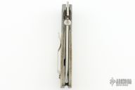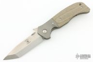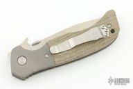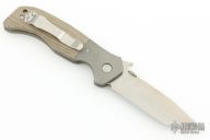 This custom Phalanx by Ernie Emerson features a hand-ground satin finish blade with a chisel grind, bead blast dovetailed titanium bolsters, and green canvas micarta scales. Stainless steel clip. Wave feature. Includes original box. Nice detent, lockup and blade seating. Has the new "Emerson Hand Made" logo.  Excellent Condition.