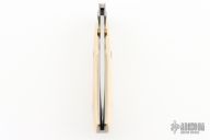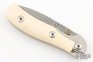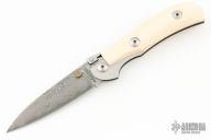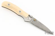This original One Handed Folder by A.G. Russell features a San Mai Damascus drop point blade with dual brass thumbstuds. The handle is comprised of an integral stainless steel frame with mammoth ivory scales, lanyard hole on pommel. Some minor scratches on frame but otherwise excellent condition.