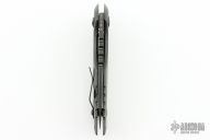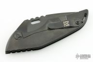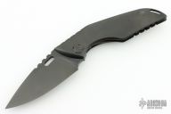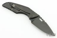 This MSC SJ75 Stealth from Mick Strider has a black blade and a black titanium frame with a matching tip up black titanium clip. Notches on blade spine and inner edges of frame along the spine. Nice detent, lockup and blade seating. Includes a padded zippered case. Excellent Condition.