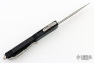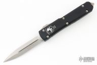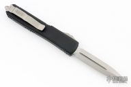 This Ultratech OTF automatic by Microtech knives features a D/E stonewashed double edged blade blade with a standard edge, and a black aluminum handle with blasted hardware, tip down carry. Glass breaker. S/N 498. Dated 09/2020. Comes with original box and papers. Excellent Condition.