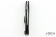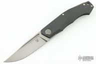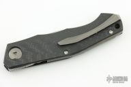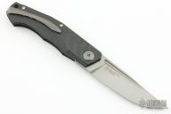 This Pero Flipper by Shirogorov and Dmitry Sinkevich features a matte finished clip point blade with fullers, notched thumbrest and flipper. The handle has a carbon fiber frame, inlaid titanium liner with stainless lockface insert and ceramic detent, matte finished titanium backspacer and tip up clip with hidden screws. Has MRBS. Comes with original box and papers. Excellent condition.