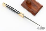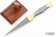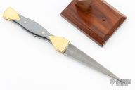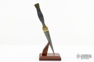 This Dagger by DV Customs features a double-edged 585 layer Damascus blade with a full tang construction .158" Blade Stock, .930" Blade Depth.  The handle has brass bolsters front and rear, smoke grey kirinite scales, fully fileworked tang.  Includes a Bolivian Rosewood stand.  S/N 213.  New from maker. Comes with COA.