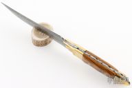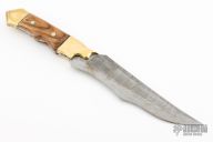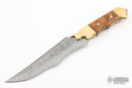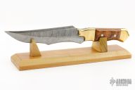 This Bowie by DV Customs features a 480 Layer Damascus blade with false top edge, .148" blade stock and 1.695" blade depth, full tang construction. The handle has brass bolsters, Bocote scales, fileworked tang. Comes with a poplar wood stand. New from maker. Comes with a COA #214