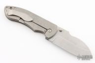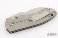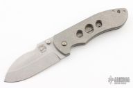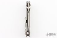 This V2 framelock folder features a stonewashed CPM-154 blade with dual thumbstuds and notched thumbramp. Handle scales are stonewashed titanium. Blade is centered when closed. Nice detent and nice solid lockup. Titanium clip is positioned for tip-up carry, lanyard hole at the base. Includes the original box and papers.  #183.  Excellent Condition.