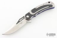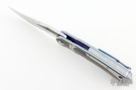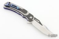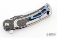 This Citadel linerlock flipper by Todd Begg features a mirror polished clip point blade with carbon fiber inlays.  The handle features a satin finished titanium frame with carbon fiber inlays over anodized titanium liners and a matching tip up pocket clip.  Titanium Backspacer.  Includes the original box and padded case. Excellent condition.