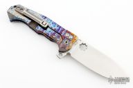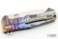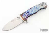 This ADV Trailboss 2 framelock flipper has a satin finished drop point blade with notched flipper and thumbdisc and thumbrest. The handle has an anodized titanium frame and tip up titanium clip and backspacer. Has stainless steel lockbar insert and lockbar stabilizer. Nice smooth action, detent, lockup and blade seating. Comes with original case. Excellent condition. Dated 2022 and #20