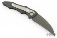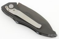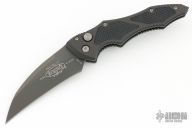 This Kestrel side-opening automatic by Microtech has a black plain edge blade and is dated 4/2000. S/N 2096. Stainless steel clip. Handle features non-slip rubber inserts. Includes a nylon sheath. Excellent Condition.