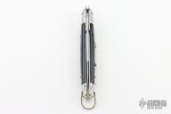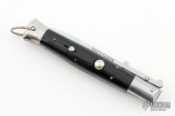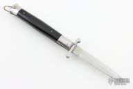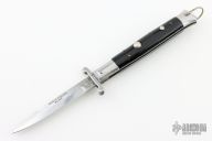 This Swing Guard Stiletto Auto has a mirror polished stainless steel spear point blade with false top edge. The handle has black acrylic scales with stainless steel bolsters and liners, nickel silver auto button and safety button, and aluminum bail. Has some light scratches, otherwise good condition.