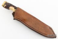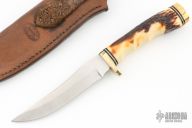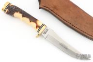 This Super Sharp by Schrade Cutlery features a satin finished blade, .133" blade stock and 1.045" blade depth, hidden tang construction. The handle has brass guard and butt with faux stag grip. Comes with brown leather sheath. Excellent condition.