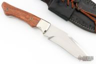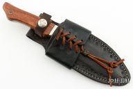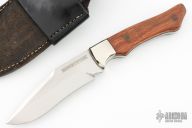 This knife by Sandown Forge features a hand rub satin finished blade with false top edge and notched thumbrest, .177" blade stock and 1.277" blade depth, full tang construction. The handle has dovetailed nickel silver bolsters, ironwood scales, mosaic pins, fileworked tang. Comes with a black leather sheath. Excellent condition.