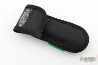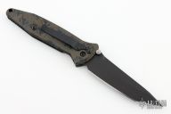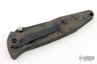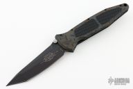 This Socom Elite M/A from Microtech has a black tanto blade with notched thumbrest and dual thumbstuds. The handle has a camo aluminum frame with rubber inlays with black stainless steel liner and tip down clip. Dated 4/99.  Comes with a nylon sheath.  Has some light scuffs otherwise the knife is in excellent condition.