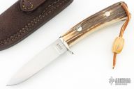 This knife by Don Byrd features a hand rub satin finished blade with .124" blade stock and .915" blade depth, full tang construction. The handle has nickel silver guard, stag scales with a lanyard hole. Comes with a brown leather sheath. Excellent condition.