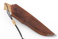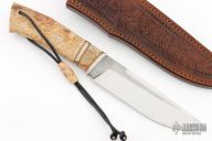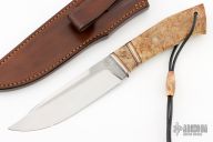This custom hunter by Pavel Murnikov features a hand rub satin finished drop point blade with false top edge, .180" blade stock and 1.377" blade depth, hidden tang construction. The handle has a satin finished titanium guard, burlwood grip with titanium/black/bronze spacers. Comes with a hand tooled brown leather sheath and original box. New from maker! Very clean! Very Classy!