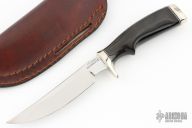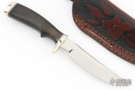 This knife by Corbit Signman features a mirror finished blade, .168" blade stock and .946" blade depth, hidden tang construction. The handle has a nickel silver guard and pommel, buffalo horn grip with white/black spacers. Comes with a brown leather sheath, not original, but fits nicely. Has a couple oxidation spots, otherwise excellent condition.