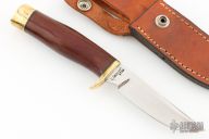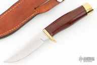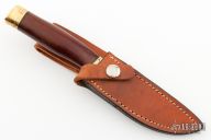 This hunter from G. Anderson features a polished blade with .143" blade stock and .884" blade depth, hidden tang construction. The handle has a brass guard and butt, brown linen micarta grip with black spacers. Comes with a brown leather sheath. Has somes light patina and light scratches, otheriwse good condition.
