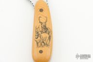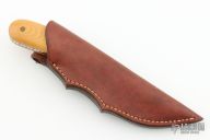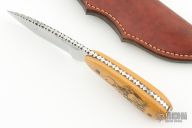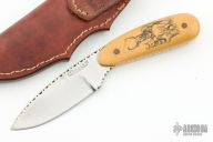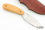 This knife by LC Finger features a polished blade with fileworked spine and tang, .189" blade stock and 1.163" blade depth, full tang construction. Yellow paper micarta scales with brass pins. Nice scrim on one side of the handle signed "LOU". Comes with a brown leather sheath. #304 on the blade. Has some scratches and patina, otherwise good condition.