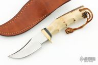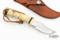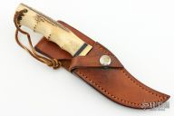 This Hunter from Cajun Knives features a mirror finished clip point blade with false top edge, .187" blade stock and 1.165" blade depth, hidden tang construction. The handle is comprised of brass guard and a stag grip, white/black spacers, lanyard hole. Comes with a brown leather sheath. Has some patina and scratches, otherwise good condition.