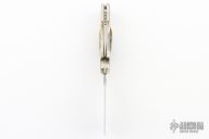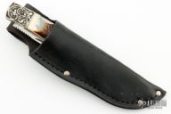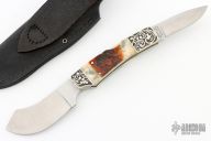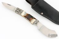 This knife by Taylor/Seto features a satin finished blade with notched thumbrest, .117" blade stock and 1.283" blade depth, full tang construction. The handle has engraved nickel silver bolsters, stag jigged bone scales, nickel silver liners, and a folding 2.375" blade in the handle. Has a few light scratches, otherwise excellent condition. Coems with a black leather sheath.