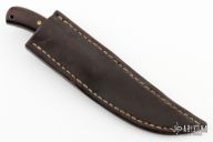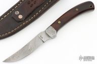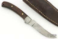 This fixed blade by Steve Brooks features a Damascus blade with .167" blade stock and .842" blade depth, full tang construction. The handle has dovetailed Damascus bolsters, ironwood scales with brass pins and lanyard hole. Includes a brown leather sheath with belt loop. Has some light scratches and patina, otherwise excellent condition.