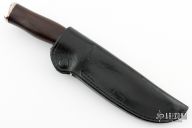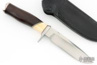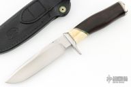 This knife by Jeff Hollett features a hand rub satin finished blade with fileworked spine, .315" blade stock and 1.148" blade depth, hidden tang construction. The handle has a stainless steel guard and butt, warthog tusk and rosewood grip with nickel silver and brass spacers. Comes with a black leather sheath. Has a couple light scratches, otherwise excellent condition.