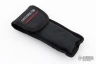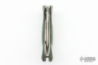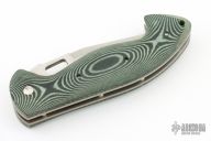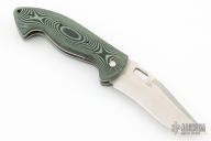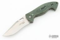 Designed by Jerry Hossom, this Hossom knife by the Ontario Knife Company features a satin finish blade with notched thumbrest and thumbhole, contoured green/black micarta scales over titanium liners. Includes original sheath and box. Nice lockup, detent and seating. Excellent condition.