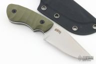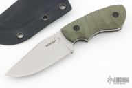 This Ridgeback by Boker is a Bill Coye design, it features a bead blast finished blade with blade thickness of .150" and blade depth of 1.300". Great feel in the hand. Handle has sculpted green G-10 scales with black liners. Includes kydex sheath and the original box and papers.  Excellent condition.