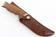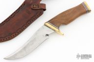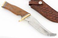 This knife by Banfill Blade features a satin finished blade with sharpened top edge, .237" blade stock and 1.431" blade depth, hidden tang construction. The handle has brass guard and butt, walnut grip with white/black/aluminum spacers. Comes with a hand tooled brown leather sheath. Has some scratches and oxidation, some pitting, fair condition.