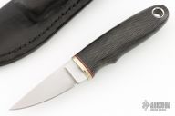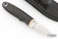 This knife by Marcus Doyle features a hand rub satin finished blade with .196" blade stock and .820" blade depth, hidden tang construction. The handle has a nickel silver guard, carbon fiber grip, red/black spacers. Comes with a black leather neck sheath. New from maker.