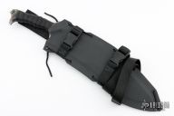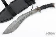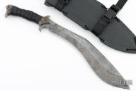 This Vakra by Zombie Tools features a kukri style blade with an intentional patina looking finish, .233" blade stock and 2.345" blade depth, full tang construction. The handle has distressed aluminum scales with black leather wrap, extended tang. Comes with kydex sheath. Has some light sheathing marks, otherwise excellent condition.