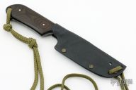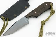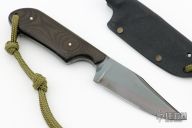 This Neck PPF from Fred Perrin features a blued clip point blade with visible hamon, swedge and notched thumbrest, .153" blade stock and 1.028" blade depth, full tang construction. The handle is comprised of micarta scales with stainless pins. Lanyard hole with lanyard in pommel. Includes kydex sheath. Has some light scuffs and scratches, otherwise great condition.