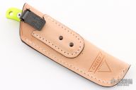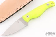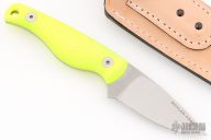 This knife by Gary Creely features a satin finished blade with .108" blade stock and 1.063" blade depth, full tang construction. The handle has yellow G-10 scales. Comes with a brown leather sheath, original box and COA. Excellent condition.