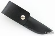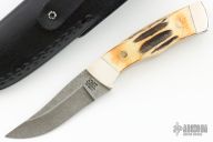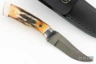 This knife by Case features a Damascus blade with .114" blade stock and .855" blade depth, full tang construction. The handle has a nickel silver guard and stag scales. Comes with a black leather sheath. Excellent condition. Dated 1990