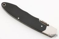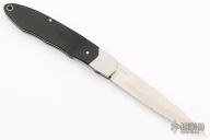 This Spyderco Solo 2000 Micarta Gentleman's Knife. It has a satin finished fully serrated blade with thumb lug. The handle has stainless steel bolsters and liners, black paper micarta scales. Has a few light scratches, otherwise excellent condition. Rare. Comes with a felt pouch.