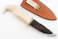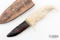 This knife features a flint knapped obsidian blade that has been attached to a jawbone with a sinew wrap. Includes a brown leather sheath. Excellent condition.