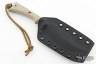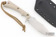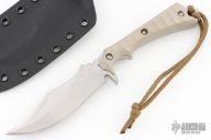 This Brooklyn Bowie by Richard Derespina features a hand rub satin finished blade with a sharpened top edge and notched thumbrest, jeweled flats, .210" blade stock and 1.201" blade depth, full tang with skull crusher and lanyard hole. Has sculpted tan G-10 scales. Comes with kydex sheath. Excellent condition.