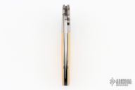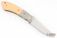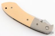 This linerlock folder from Keith Coleman features a hand rub satin finished blade with single checkered thumb stud and notched thumbrest. The handle has satin finished dovetailed titanium bolsters and yellow paper micarta scales over jeweled titanium liners and black backspacer. Nice lockup and blade seating. Has scratches, otherwise good condition.