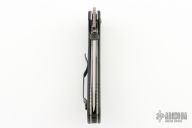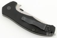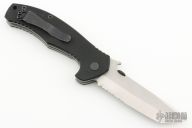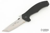 This Mini Roadhouse by Emerson has a stonewashed tanto blade with a partially serrated edge, custom titanium thumbdisc and wave feature. #536 on blade, dated 2011. The handle has black G-10 scales, titanium liners and a tip up clip. Nice detent, lockup and blade seating. Has some scratches, has been sharpened, otherwise good condition.
