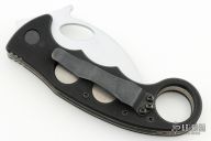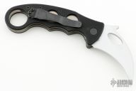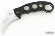 This Emerson Karambit has a silver coated chisel grind blade with notched thumbrest, thumbhole and wave feature. Handle is black G10 with titanium liners, and black tip up black stainless steel clip, left or right reversible. S/N 0981 and dated 2007. Has some scuffs and marks on the blade finish, otherwise good condition.