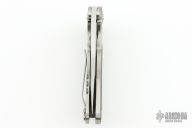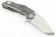 This CWC flipper from Mikkel Willumsen features a satin finished blade with flipper. The handle has a stonewash finished titanium frame with black G-10 inlay, tip up stainless steel clip. Rides on bearings, blade seating, lockup and detent. Has some scuffs and scratches, has been used and sharpened, otherwise good condition.
