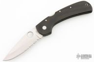 This Wayne Goddard knife by Spyderco features a satin finished blade with thumbhole and serrations. Signed by Wayne Goddard on the blade. The handle is black linen micarta. Has scratches, has been used and sharpened, otherwise good condition.
