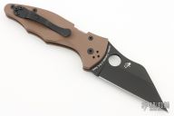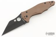 This Yojimbo 2 Folder by Spyderco Knives has a black DLC coated CPM S90V wharncliffe blade with thumbhole. Handle has brown sculpted G-10 scales with stainless steel liners (top-side lock), and a tip up black reversible stainless steel deep carry clip. Excellent condition. Comes with original box, papers.