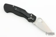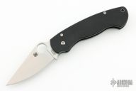 This Paramilitary from Spyderco has a satin finished clip point blade with thumb hole and notched thumb rest. Handle is black G-10 with stainless steel liners and a black stainless steel clip. Excellent condition. Comes with original box.