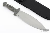 This Combat Smatchet by Boker features a double edged bead blast finished blade, .174" blade stock and 2.795" blade depth, full tang construction. The handle has black/white linen micarta scales. Comes with a black nylon sheath with a belt loop. #0333/1200 on blade along with "Rex Applegate  W.Z. Fairbairn". Has some light spots on the ricasso, otherwise excellent condition.