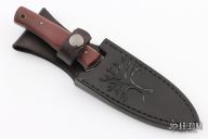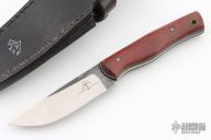 This Bird and Trout by Jarrett Fleming features a satin finished blade with forged finished flats and a full tapered tang construction, .147" blade stock and 1.033" blade depth.  The handle has purple heart wood scales with mosaic pins and gray/black liners.  Includes a hand tooled black leather sheath and a zippered case. Excellent Condition.