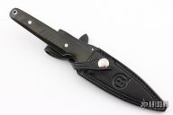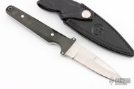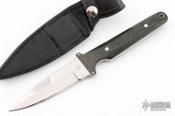 This knife by Robert Rippy features a satin finished blade with .197" blade stock and 1.079" blade depth, full tang construction. The handle has black linen micarta scales and stainless steel pins and lanyard hole. Comes with a black leather sheath. Has a couple very light scratches, otherwise excellent condition.